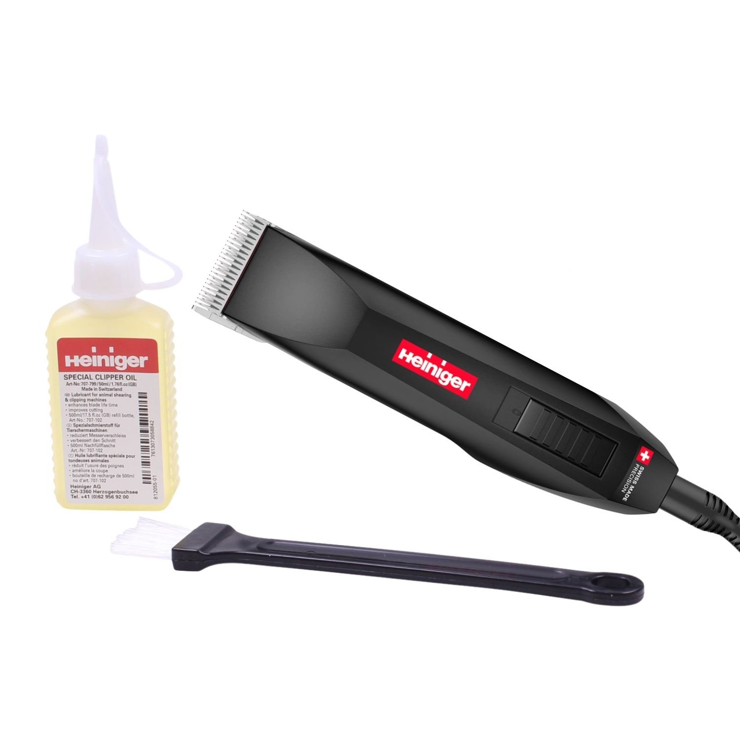De Heiniger Onyx Tondeuse met Draad #10 wordt volledig geleverd met alles wat je nodig hebt, waaronder de tondeuse zelf met draad, scheerkop #10 (1,5 mm), scheerolie en een borsteltje om je tondeuse schoon te houden.