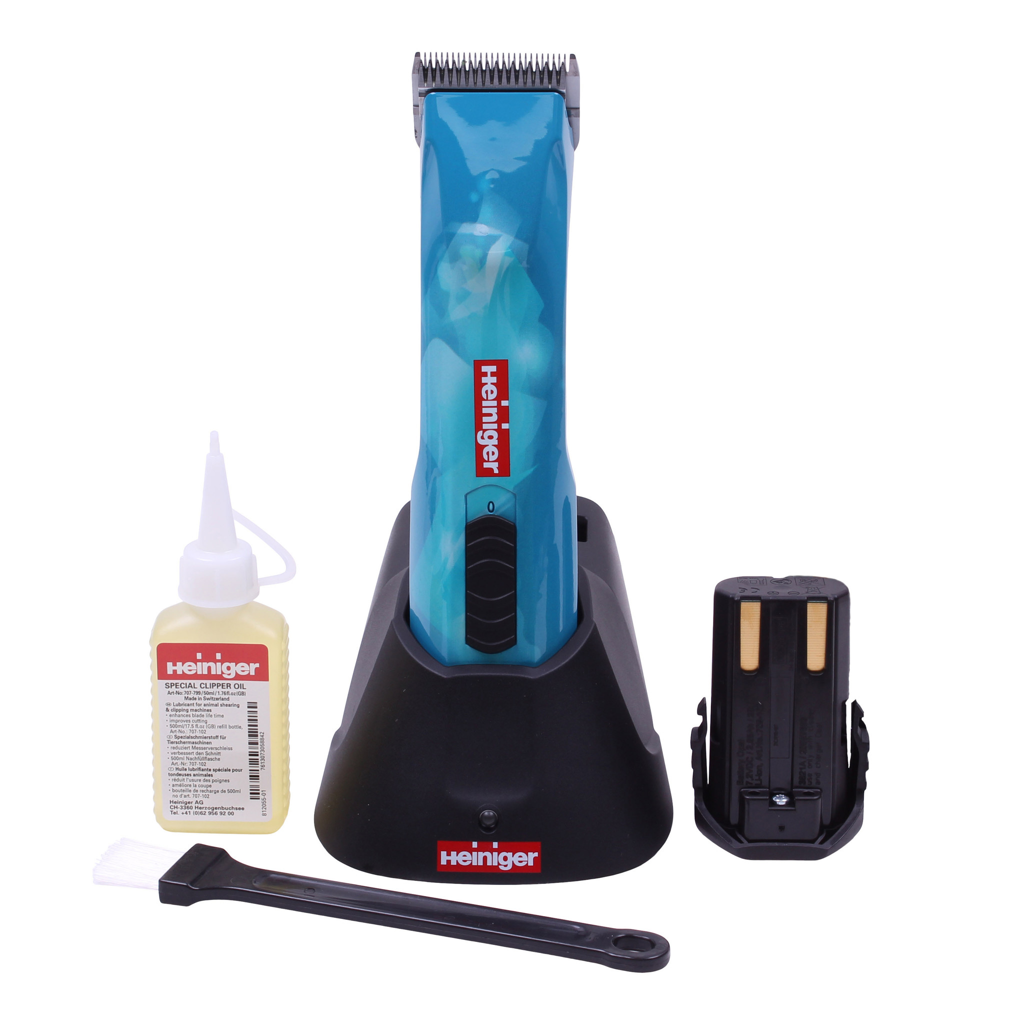 De Heiniger Opal accu-tondeuse wordt compleet geleverd, scheerkop #10 1,5 mm, laadstation, 1 accu, olie, schoonmaakborstel en handleiding.