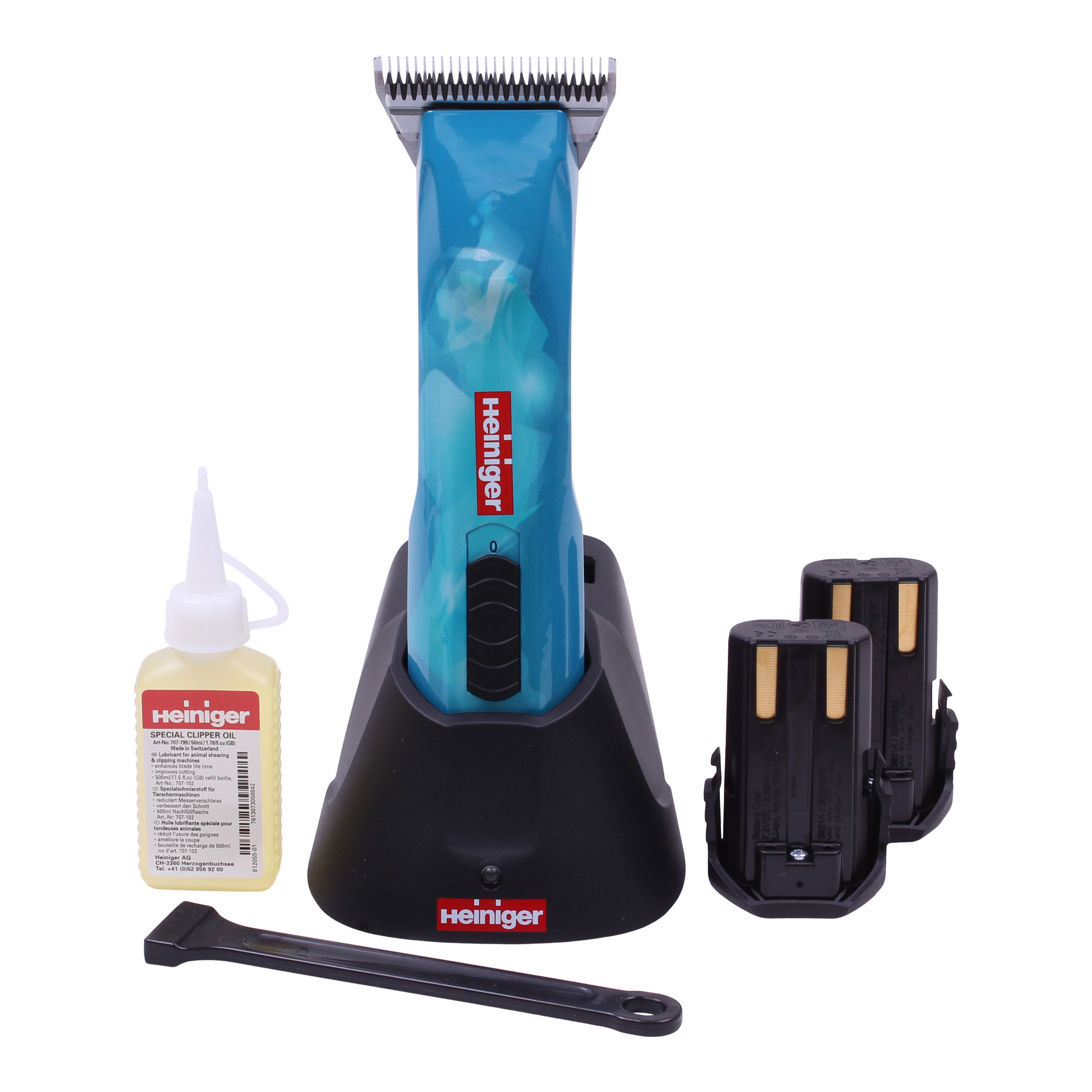 De Heiniger Opal accu-tondeuse wordt compleet geleverd, scheerkop #10W 2,3 mm (63 mm extra breed), laadstation, 2 accu's, olie, schoonmaakborstel en handleiding.